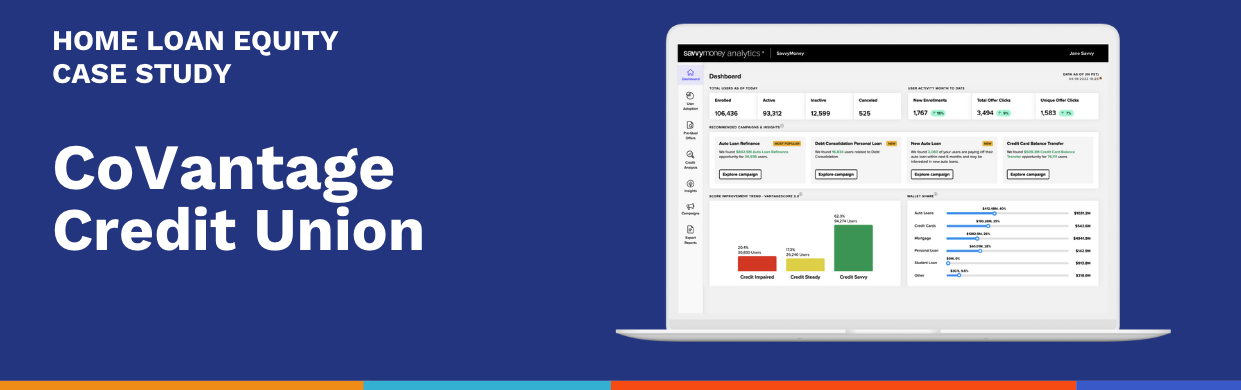 CoVantage Credit Union partnered with SavvyMoney to enhance their financial wellness offerings and leverage data-driven insights to boost home equity loan growth. By utilizing SavvyMoney’s advanced analytics, the credit union successfully targeted and personalized its home equity loan offers, resulting in substantial engagement and impressive loan growth.